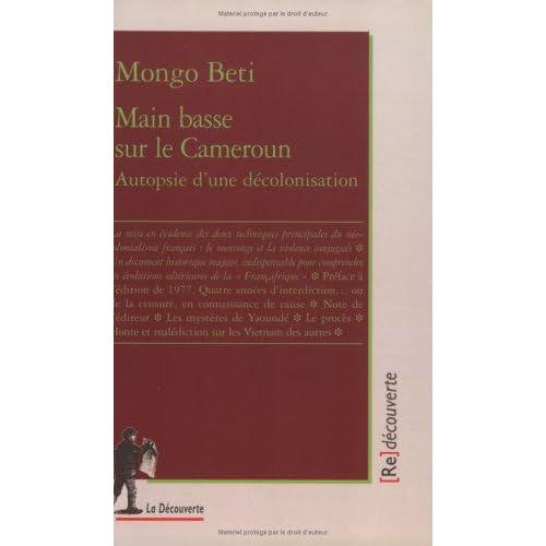 Mongo Beti, écrivain camerounais, est connu pour ses romans, notamment ceux des années 1950 (Ville cruelle, sous le pseudonyme d'Eza Boto, Le Pauvre Christ de Bomba), qui ont joué un rôle important dans la prise de conscience du colonialisme et clans la lutte contre celui-ci. Publié en 1972 par les Éditions François Maspero, Main basse sur le Cameroun était un réquisitoire contre les crimes du président Ahidjo, dictateur du Cameroun par la grâce du néocolonialisme français. Son but fut largement atteint, semble-t-il, puisque le livre fut interdit, saisi, l'éditeur poursuivi et l'auteur l'objet de multiples pressions et menaces. Sa réédition, en 1977, dans une version revue, était toujours d'une actualité brûlante à l'heure de l'intervention française au Zaïre. Mongo Beti montre en effet que les anciennes colonies d'Afrique occidentale française et d'Afrique équatoriale française, formellement indépendantes depuis les années 1960, n'en sont pas moins restées étroitement contrôlées par la France. Un document historique majeur, indispensable pour comprendre les évolutions ultérieures de la " Françafrique "